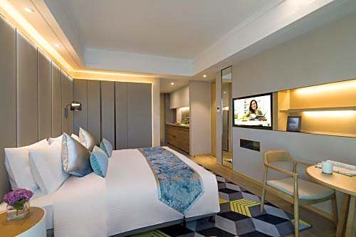 This studio has a washing machine, kitchenware and tile/marble floor.